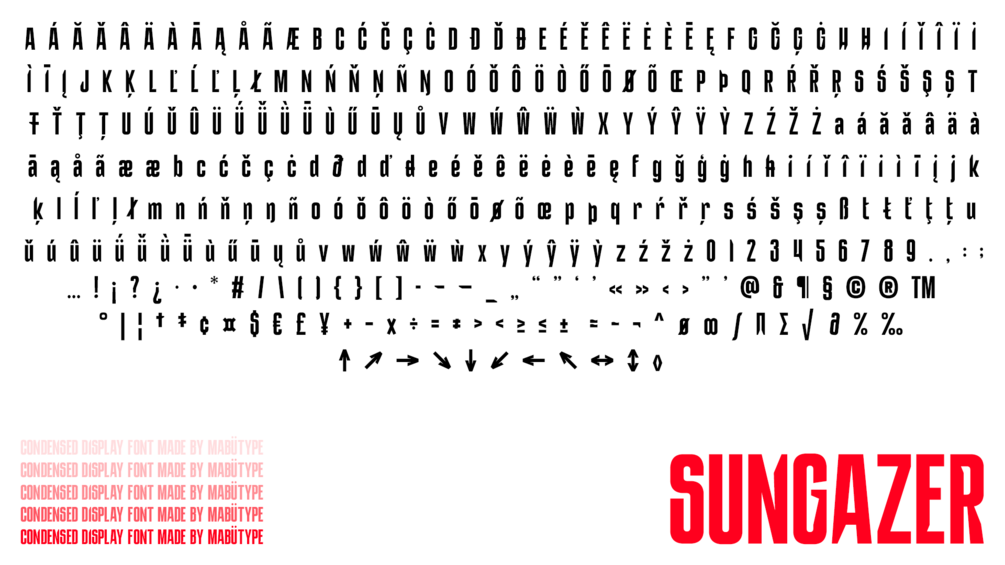 Sungazer is a bold, impactful sans-serif condensed typeface, artfully crafted to pack more text into your headlines without sacrificing its distinctive flair and aesthetics. Perfect for enhancing your creative projects on flyers, posters, banners, and merch.